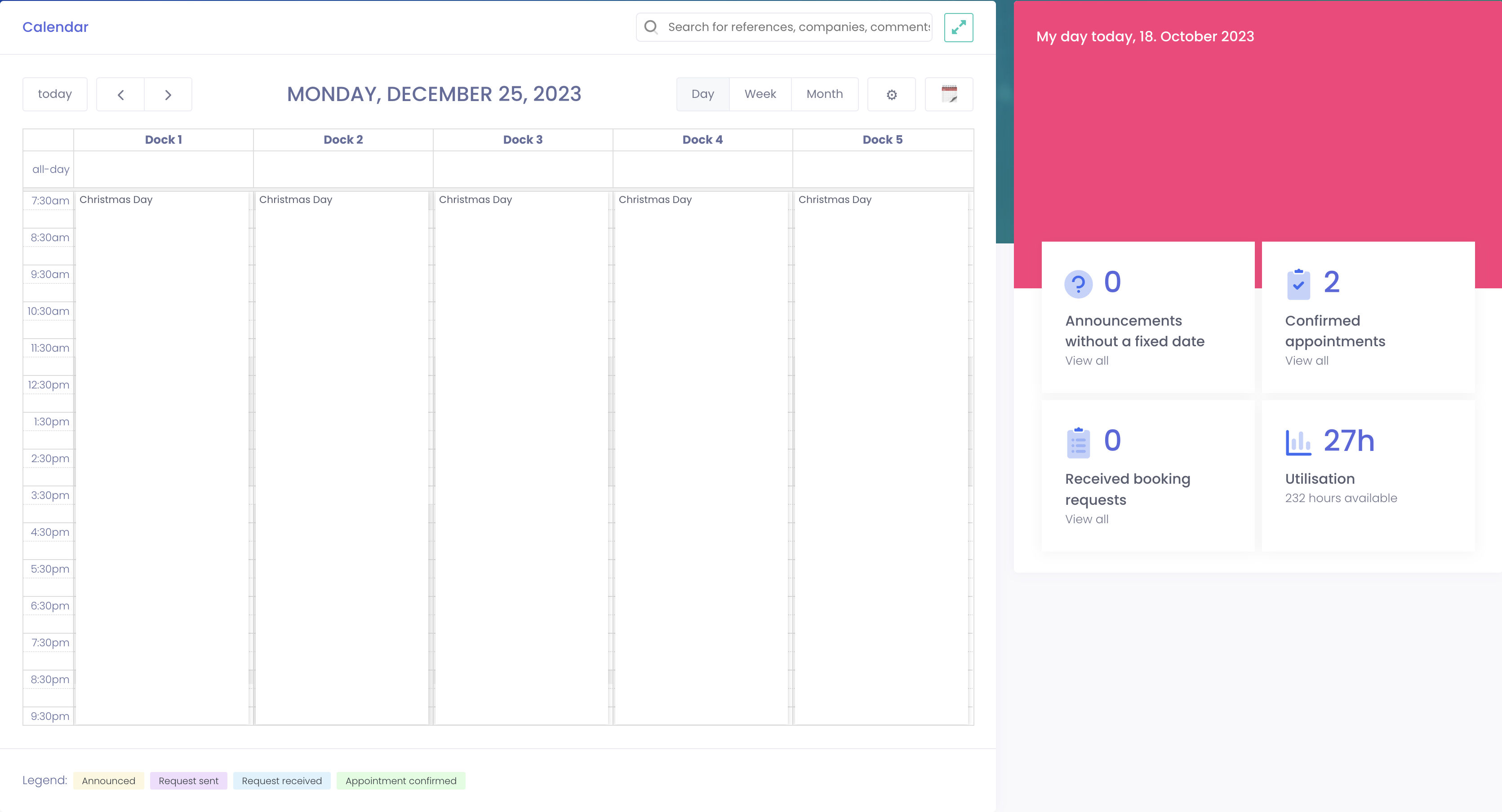 To prevent forwarders or suppliers from booking into your calendar on public holidays, you can block your calendar for these days - without any manual effort and matching your location!