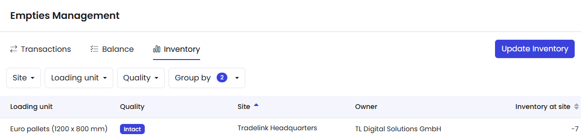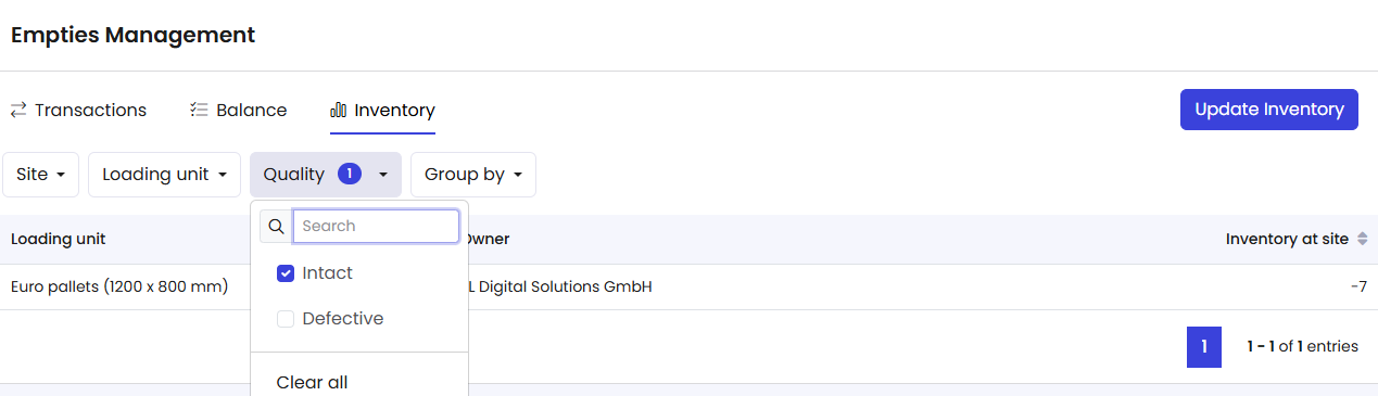 You can easily see how many load carriers you have on site via the ‘Inventory’ tab. You can filter by location, type of load carrier and quality.