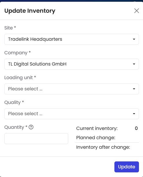 Select the type, quality and quantity of the load carriers and click on ‘Update’. The initial or updated inventory will then be displayed.