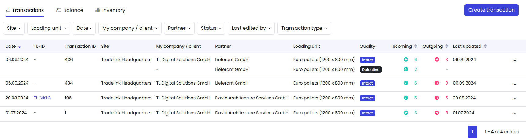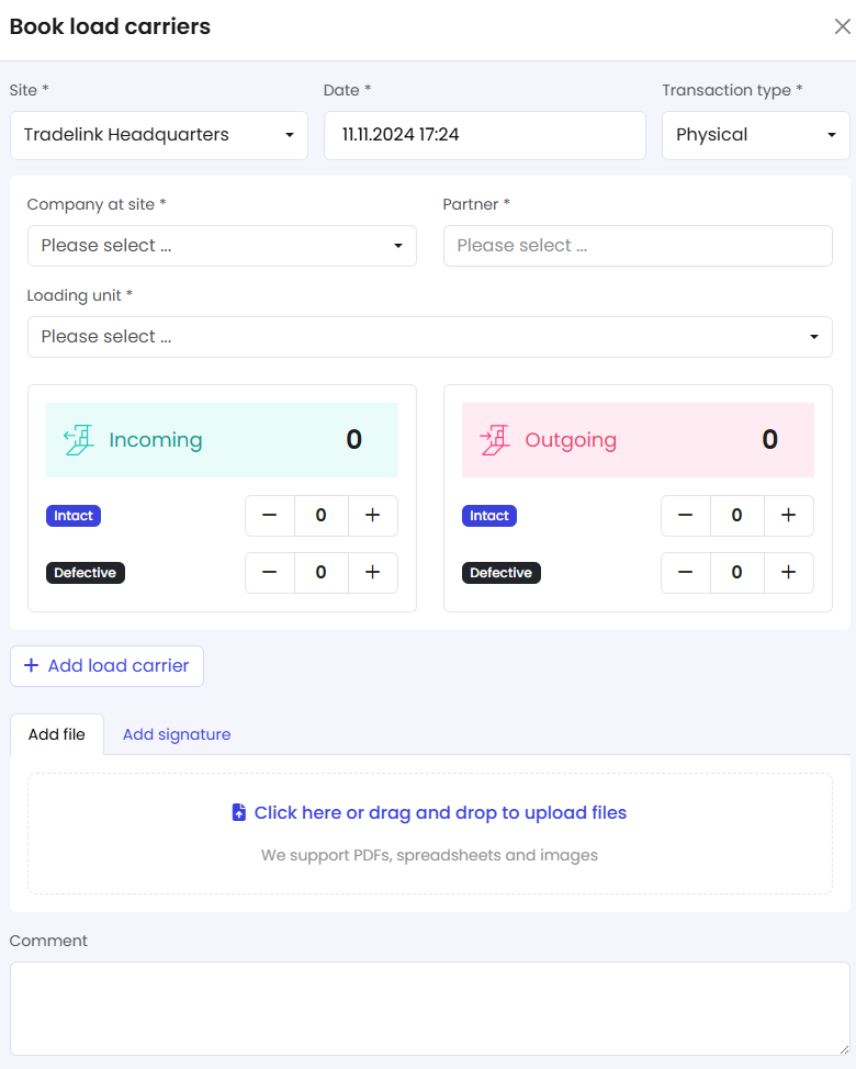1. Select the location, booking time of the transaction (if different) for which you want to book load carriers and add all relevant information such as exchange partners, etc.
