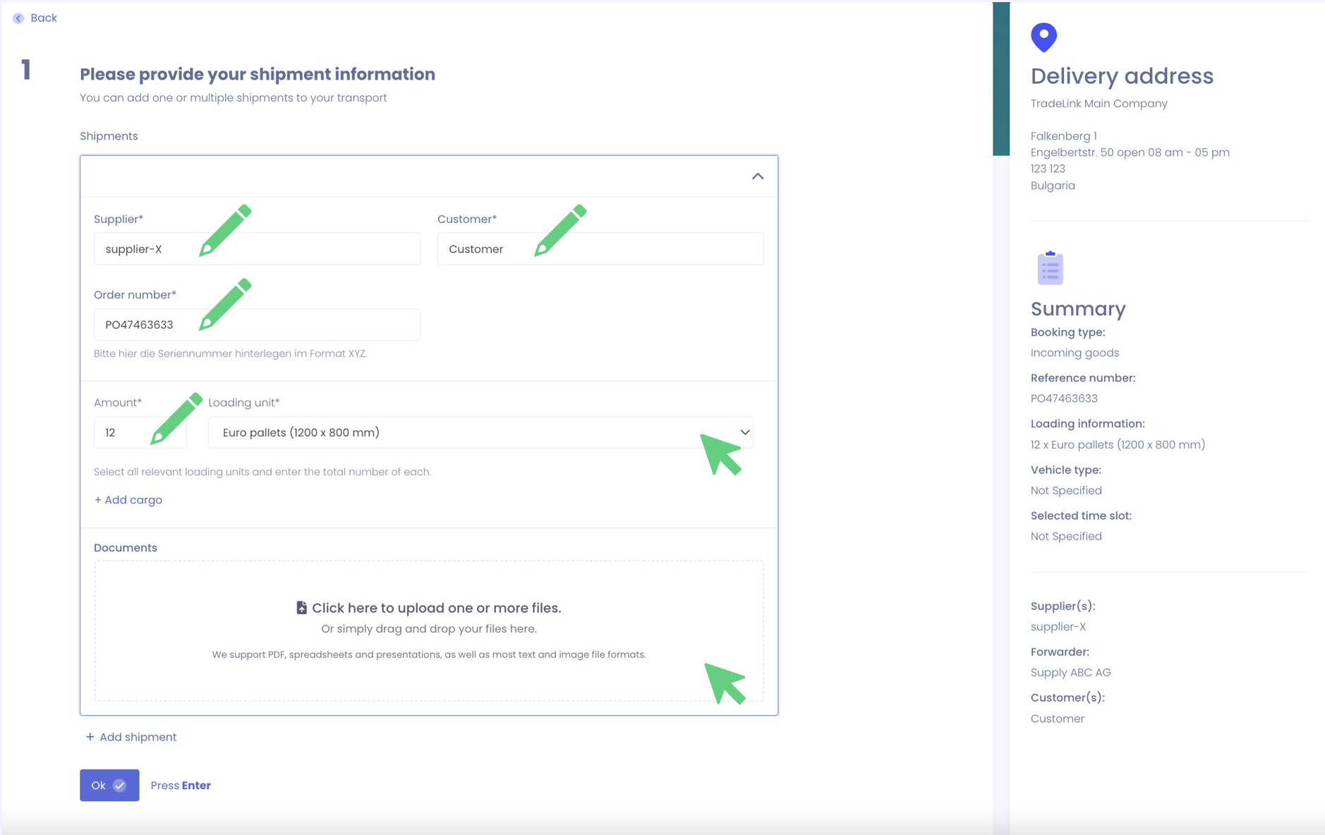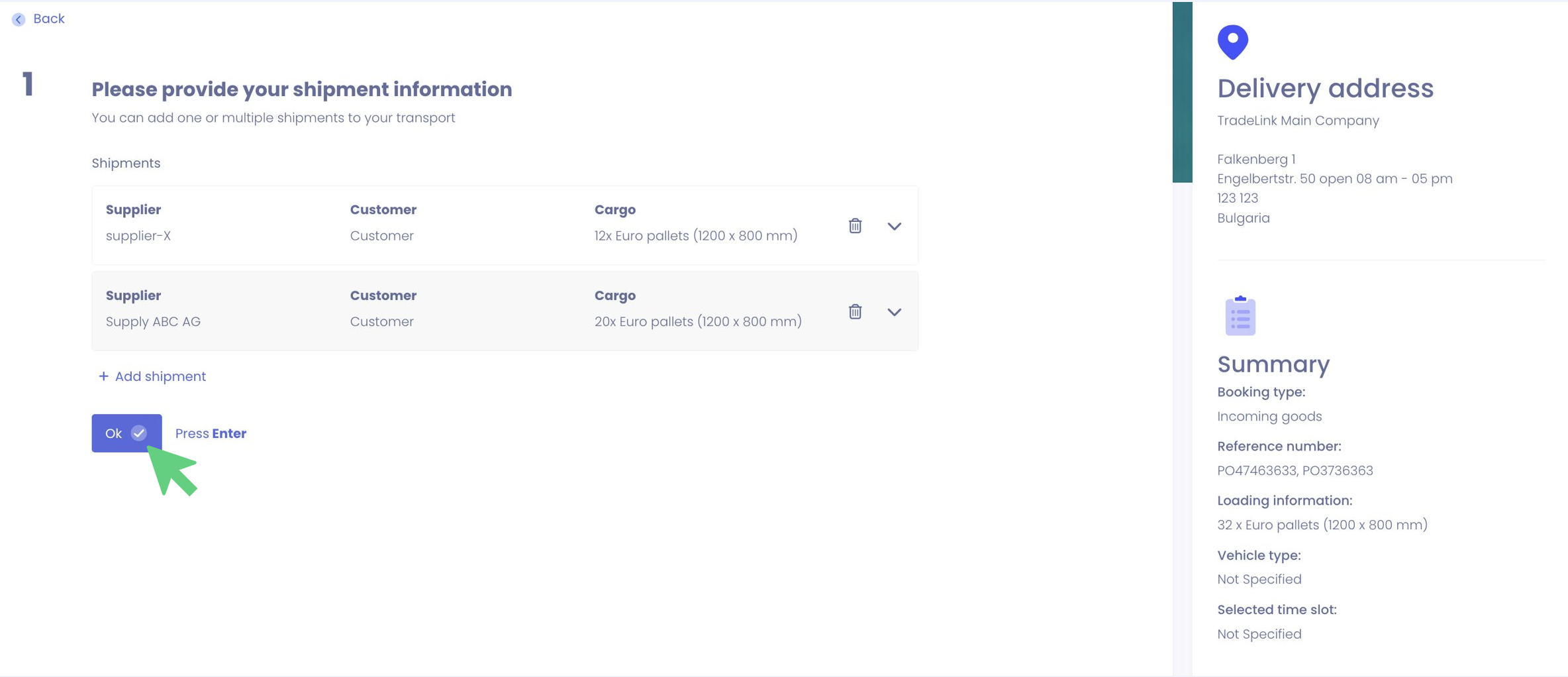 Once all shipments have been created and the information is correct, click on "Ok" or press Enter to select the vehicle and a suitable time slot in the next step.