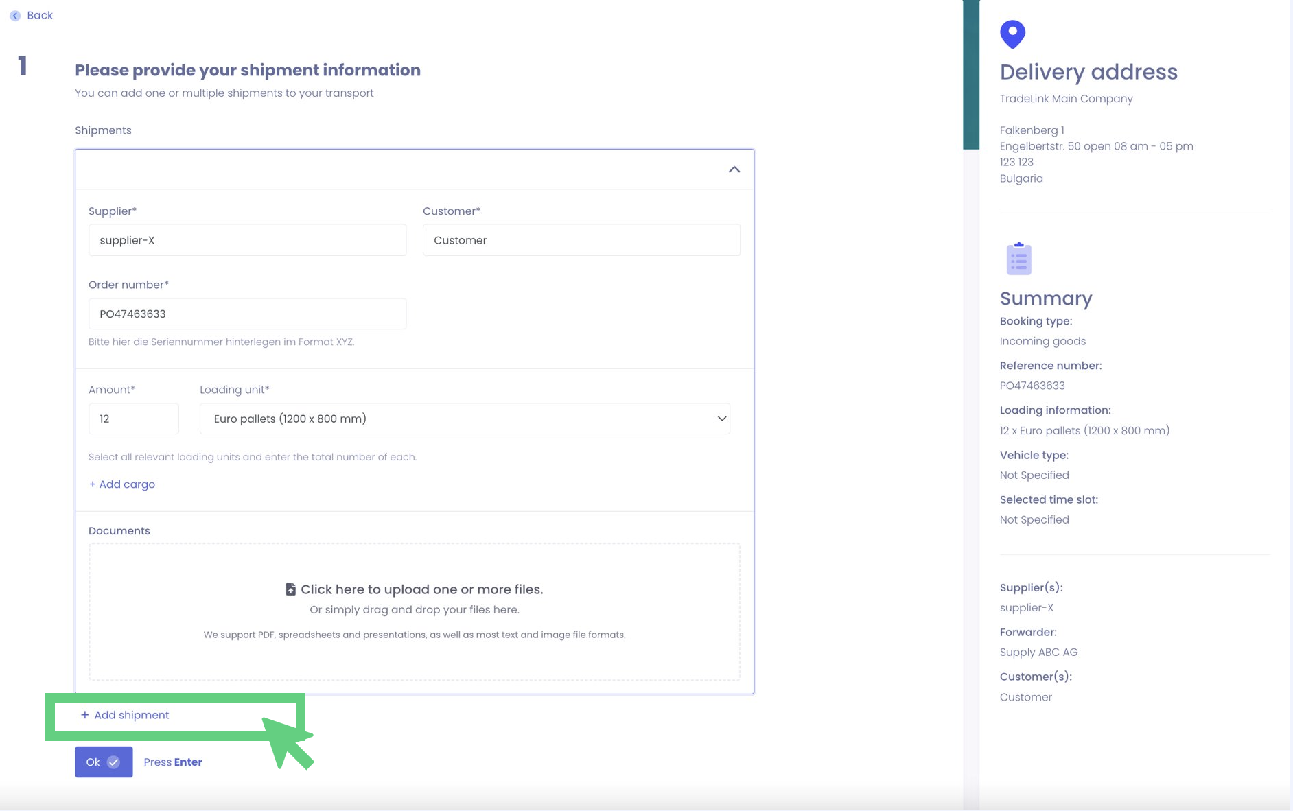 After all the fields for the first shipment have been filled, click on "Add shipment". The fields for the second shipment will then appear. You can repeat this step as often as you need, depending on how many shipments will be on the transport.
