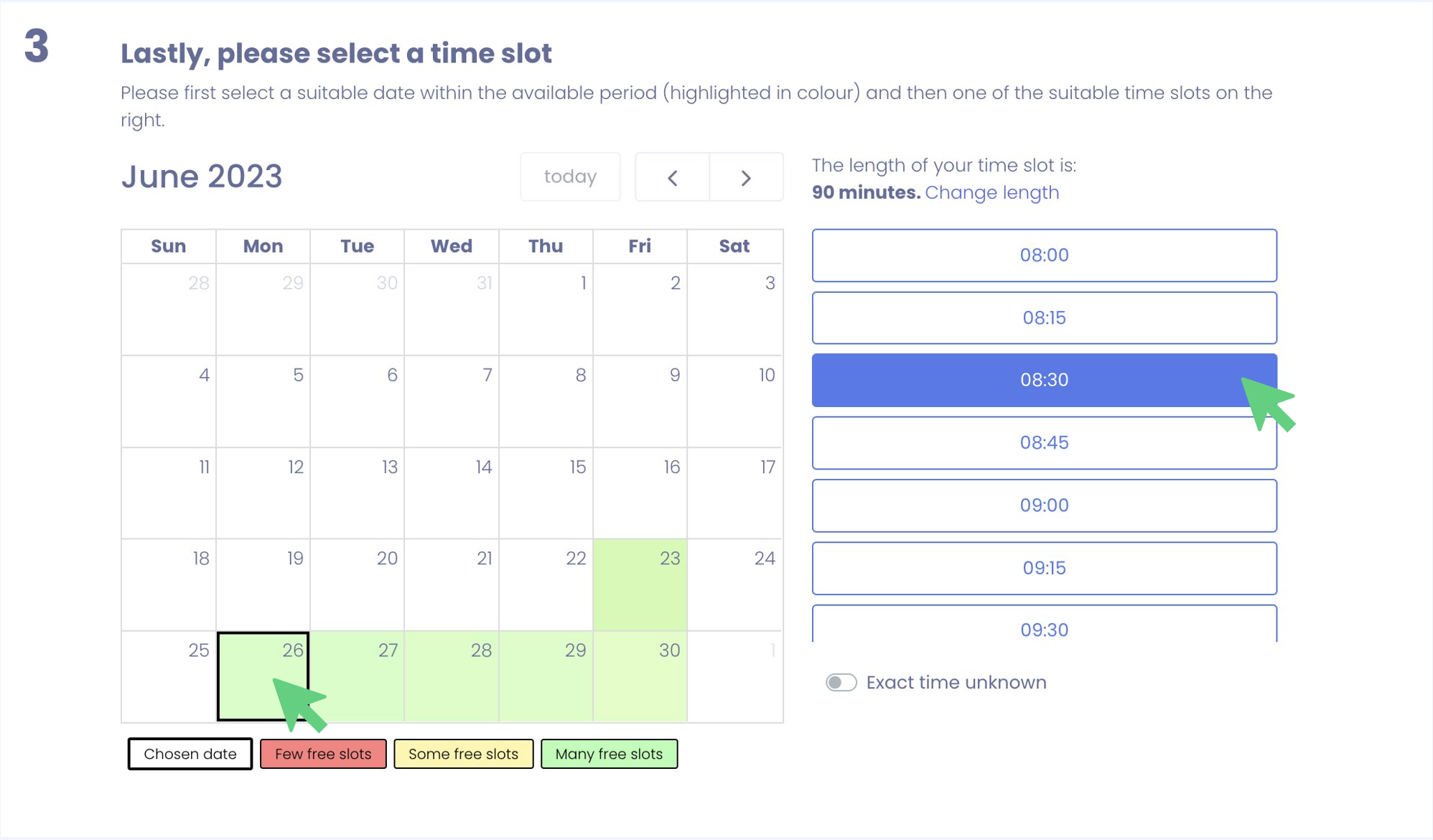 To do this, click on the day of delivery in the monthly view on the left, which will list the available time slots for this day in the right part. Choose a time slot that suits you and confirm it by clicking on the time slot.