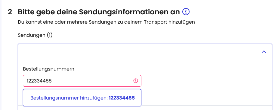 2. as soon as you are asked to enter your shipment information, you will now be asked for an order number instead of a reference number. Here you can enter the number you know, typically the commission number (KVNR) or the AB number (ABNR).