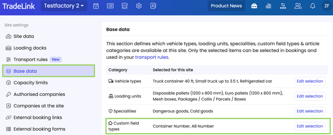 In the site settings, you will find your site’s base data. Here you can add the custom fields created at company level to your site.