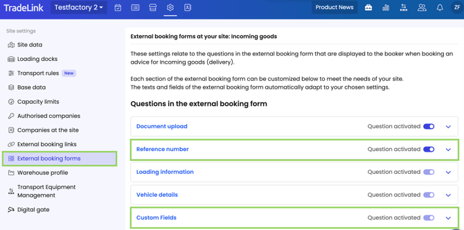 Custom fields at shipment level are located in the “References” section. Here you can also decide whether fields are optional in your partners’ booking form and which fields must be completed by the partner.