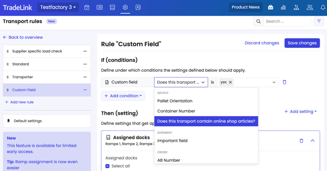 You can also add all custom fields for advices and shipments as conditions in the transport rules.