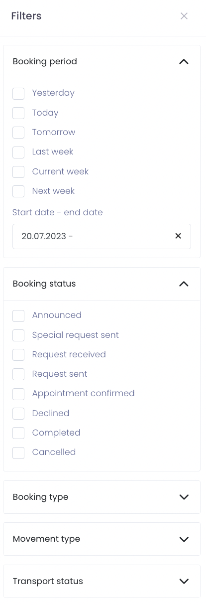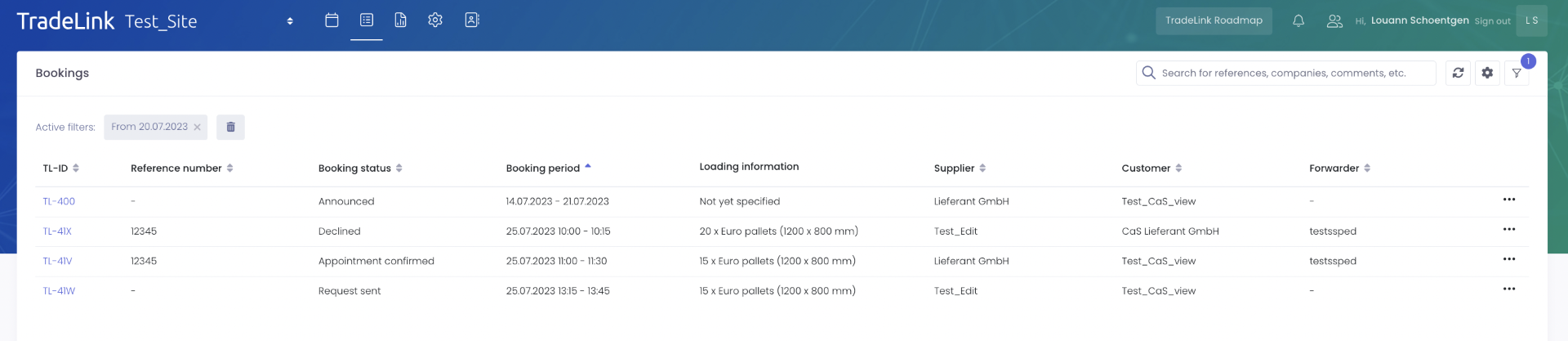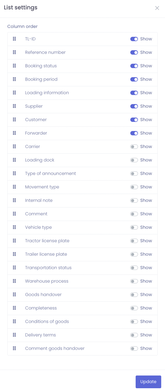 In the settings, you can choose which information you want displayed in the list view. For example, you can display the appointment status including TL ID, the parties involved in the transport, the reference and many more.