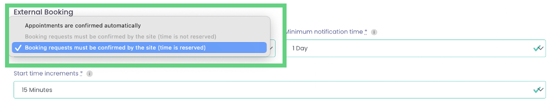 "Booking requests must be confirmed by the site": Here, each booking is initially considered a request that already "reserves" a slot in the calendar. The partner has to wait for your final confirmation. Appointments can also be rejected directly.