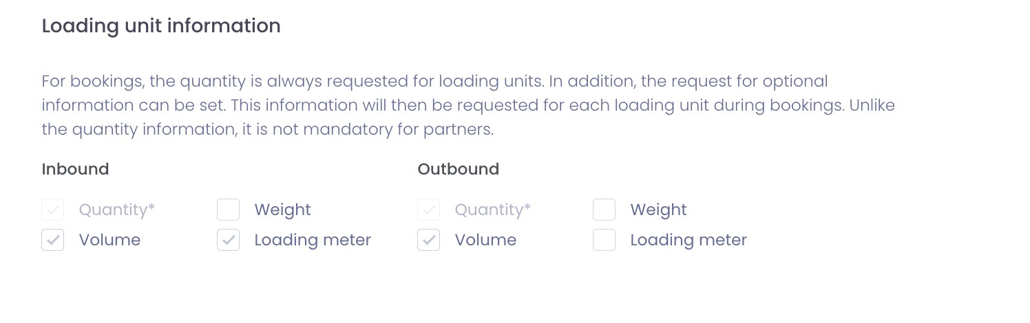 Under 'Loading unit information' you can specify which additional information (e.g. Volume) should be specified for the respective loading units when booking.