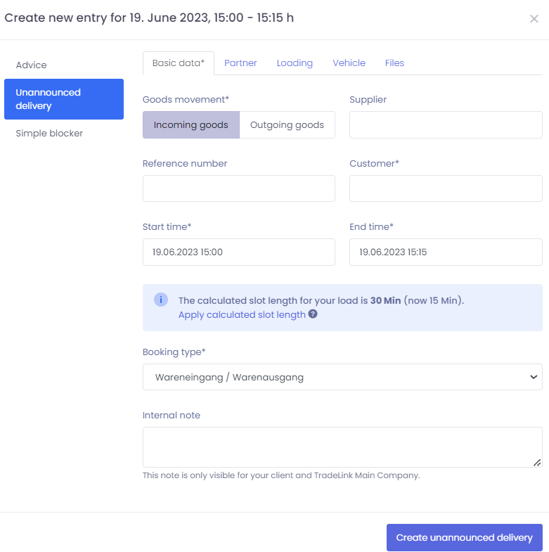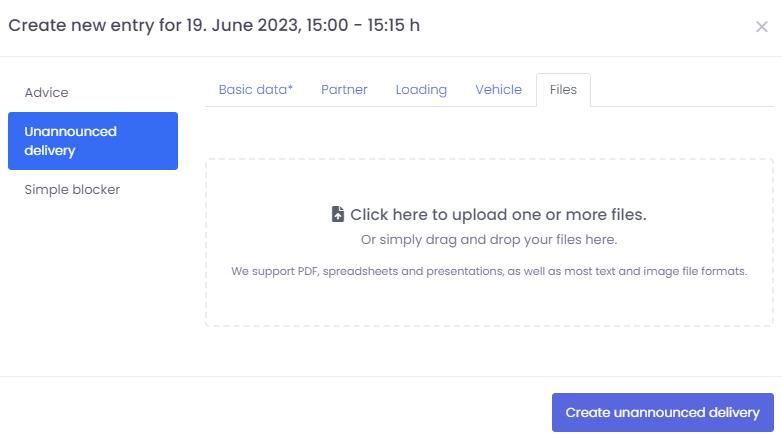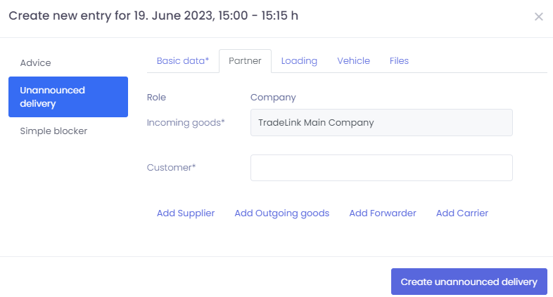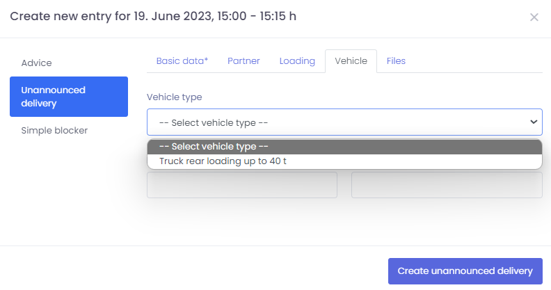 If a truck arrives unanounced at your yard, "Unannounced deliveries" allows you to enter this shipment, that has not been previously booked into the system by your partner, into your calendar.