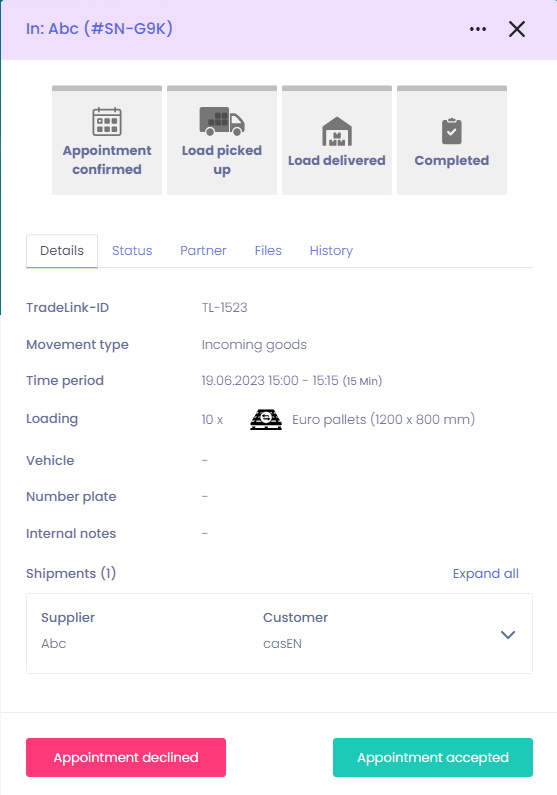 When you have entered all the important information, you can create the transport by clicking on "Create unannounced delivery". The booking will then appear in the calendar as purple with the status "Appointment request sent", as it was created internally.