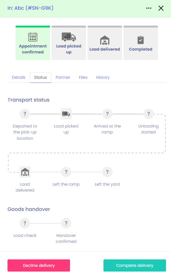 When all status points have been set, you can complete the booking by clicking on "Complete delivery". The booking is now highlighted in green in the calendar and has the status "Appointment confirmed".