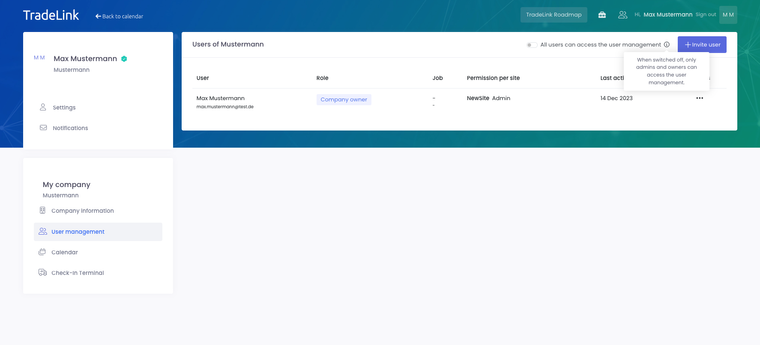 Generally, all users in the role of Company Owner/Admin have access to user management and can invite additional users. Furthermore, Company Owners/Admins can configure in the user management whether Standard Users can invite additional colleagues.