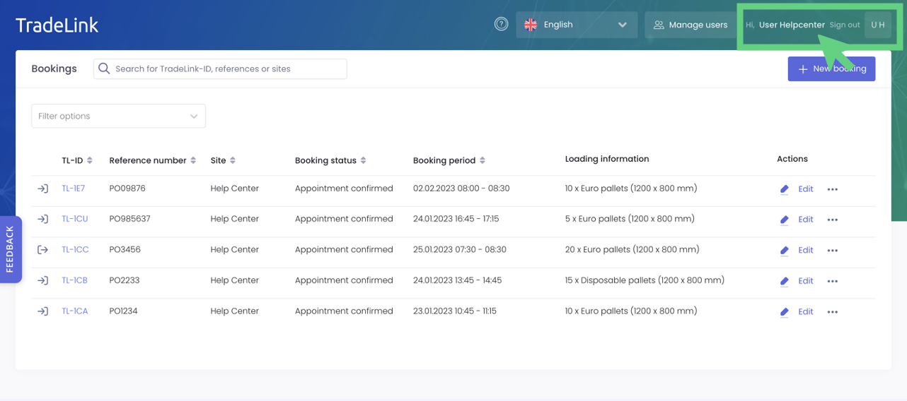 Log in to TradeLink with your user account and click on your name in the upper right corner.