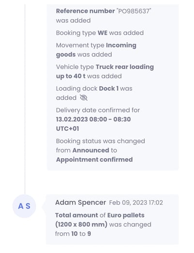 Below the detailed display of the booking is the change log. Here, all progress and changes to the booking are listed chronologically for all partners assigned to the booking.
