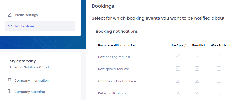In your personal profile, in the 'Notifications' section, you have the option of individually setting whether you are notified by e-mail, in the TradeLink platform or in your browser in the event of a new booking or booking change.