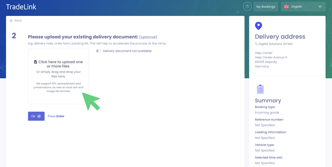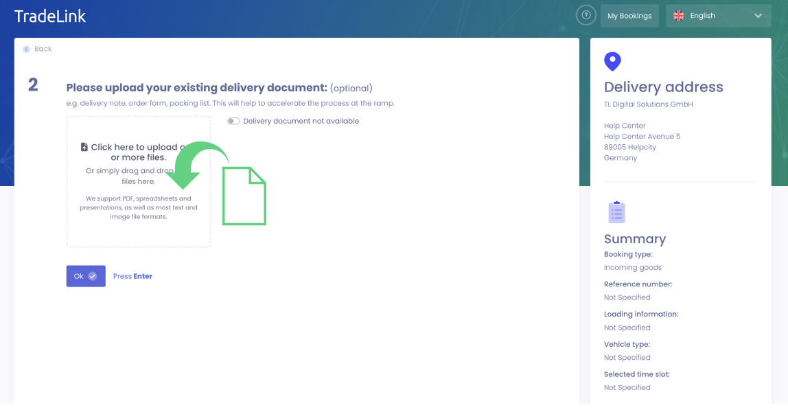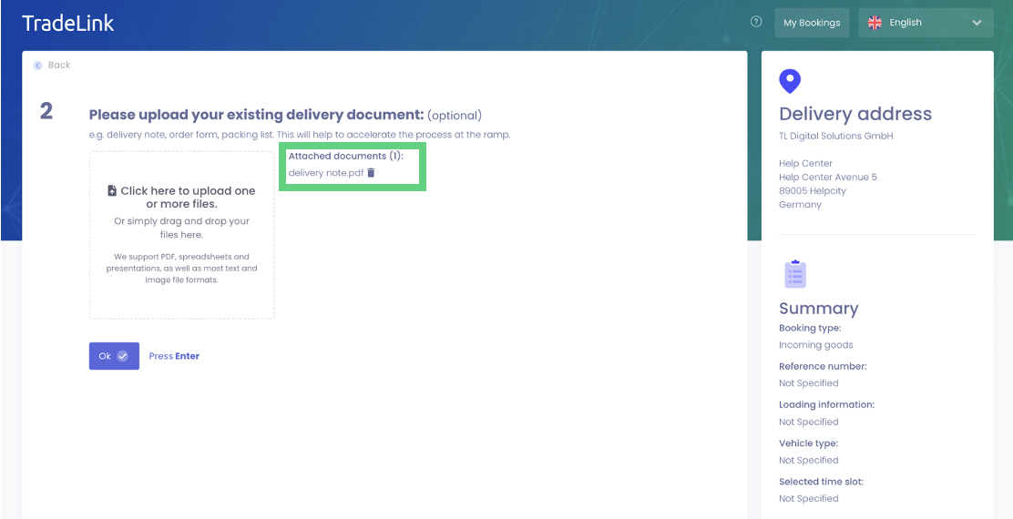 How can I add documents to my booking when booking a slot with via TradeLink? | TradeLink Help Center