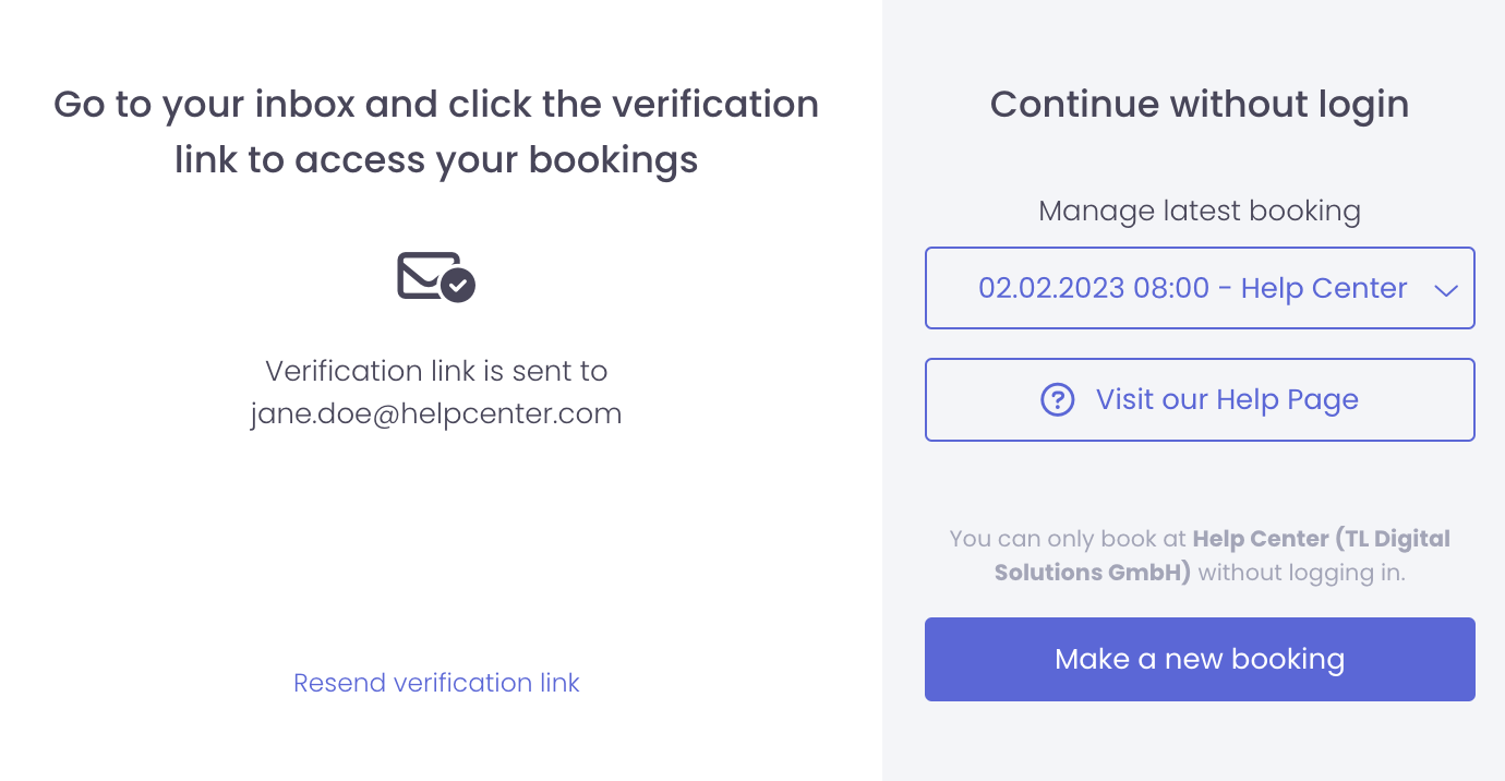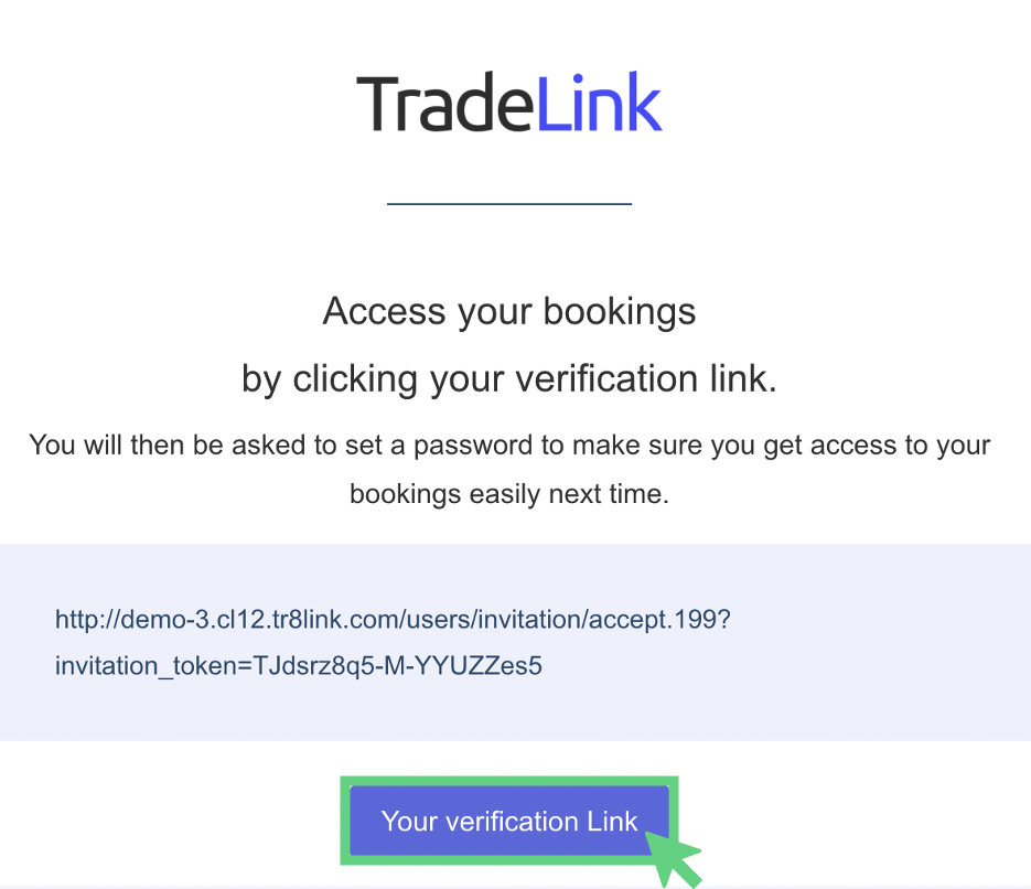 You will then see that an email with a confirmation link has been sent to you (your email is already linked to TradeLink due to the booking link sent previously).