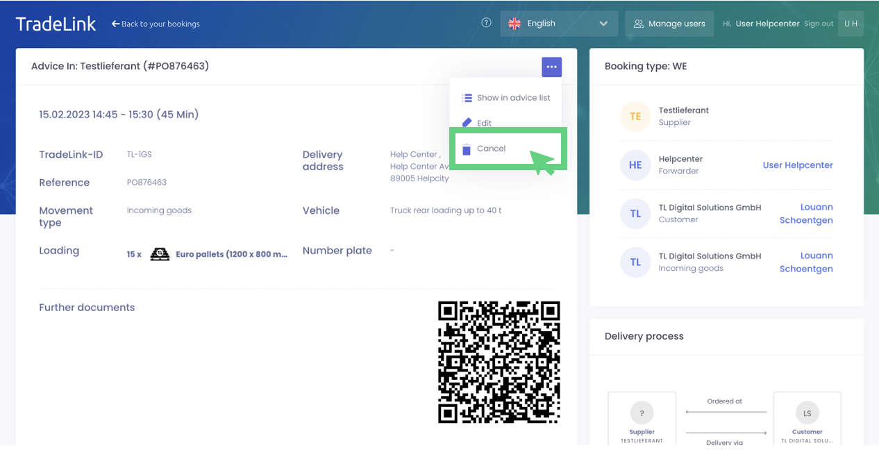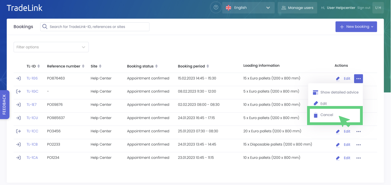Once you have logged into your TradeLink account, you can cancel your booking by clicking on the three dots next to the booking you wish to cancel on the right side of your screen. Then click on "Cancel."