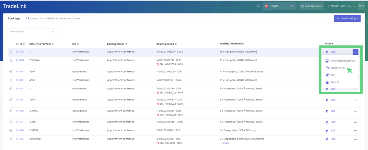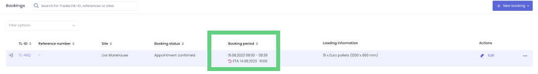 Once you have saved your changes, the ETA with the new date and time will appear under the status “Booking period” in your list overview.