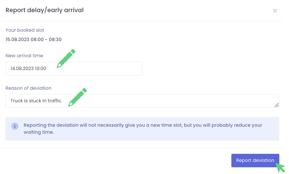 You can now enter your (new) estimated time of arrival and optionally leave a comment and/or a reason for the deviation and save your changes by clicking on “Report deviation”.